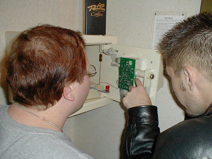 Who did this? James (Postal_Phreak), James (Pharos), Mike (PipeVegas), and Justin (Program) Where did we do it? At the Rio hotel in Las Vegas Why did we do it? Boredome mostly ;). When we checked into our room, we noticed that the previous occupants had locked the safe open. (Meaning the bar was out to keep it shut, but the door was open so we could not close it). We fiddled with it all week, entering codes now and again trying to get it open but failed. There was this big screw on the inside that just wanted to be unscrewed, but we didnt have the proper tools. On Friday night, Justin and Mike stopped by and we were a bit bored so we were determined to crack the safe. I called the front desk and asked for a screwdriver. She transfered me to the bar. *bzzt* Wrong screwdriver. I tried again, and specified that I wanted a REAL screwdriver. The maintenance man came up, but wouldnt let us keep the screwdriver. He probably thought we were gonna take the hotel apart or something.. *pfft* We'd never do that ;). So we shooed him away. Justin remembered he had a screwdirver in his car, so we made him go get it. Our victim... The first thing to do was remove the screw we've been tinkering with all week. Piece of cake... with the right tool. Now that the cover is off, we have to examine the circutiry and see what we got ourselves into. Looking under the safe for the power cord. Disconnecting the power and hoping some sort of alarm doesnt go off. Maybe if we manually spin the gears it will let us in... Nope. What's behind here? .. Lets take it off and see. AHA! A backup battery to disconnect. So we disconnected the battery and the power. We waited about 30 minutes for the battery to die and success, the safe was open. Then we closed the safe back up and pretended like nothing had happened. The things you do when you're bored. |